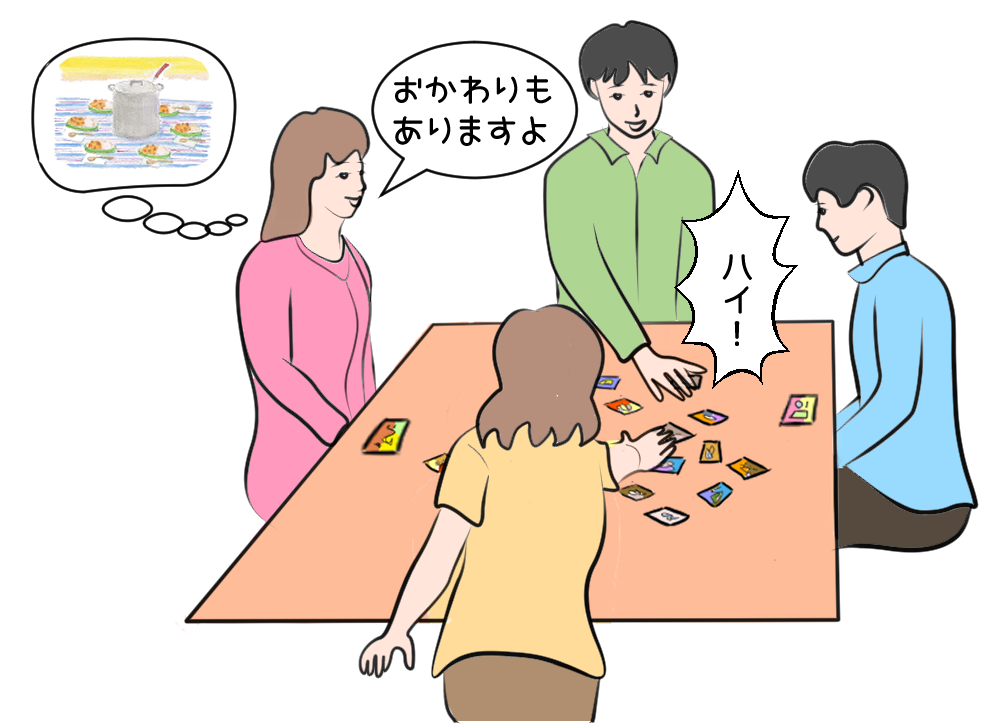 カードを持っている人は、シャッフルしたカードの上から順番に絵を1枚ずつ、みんなに見せます。